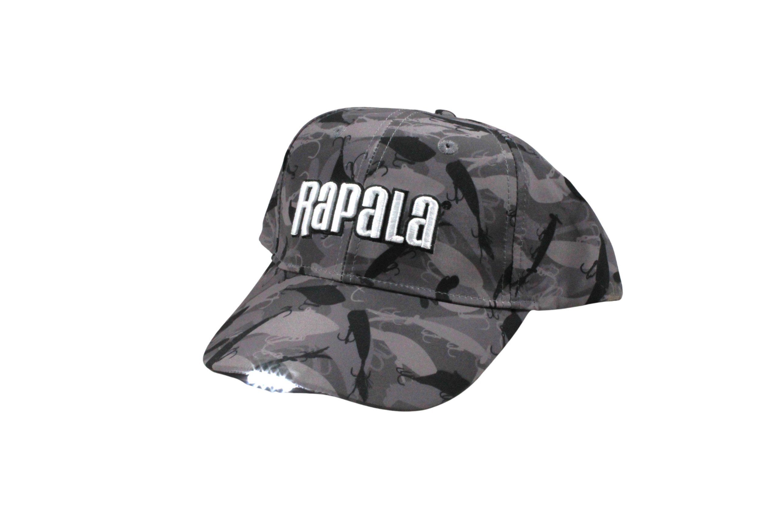112160 gorra RAPALA GORALED camouflada gris con motivos de señuelos y luz de 5 leds.